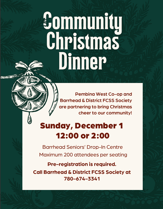Please join us December 1st for a wonderful Christmas Dinner sponsored by Pembina West Co-Op and Barrhead & District FCSS Society. The dinner is free for everyone who wishes to attend! There are two sittings, at noon and 2 pm. Please call the FCSS office at 780-674-3341 to register today. Location is the Seniors’ Drop-In Centre in Barrhead.