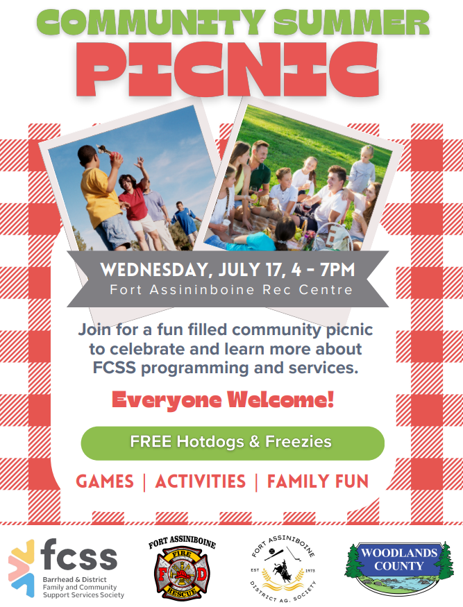 EVERYONE WELCOME!! Join us on Wednesday, July 17th between 4 and 7 pm at the Fort Assiniboine Recreation Centre for a fun-filled community picnic to celebrate and learn more about FCSS programming and services!! Games, activities, and family fun! Free hotdogs and freezies! Sponsored by FCSS, Fort Assiniboine Fire and Rescue, Fort Assiniboine District Ag Society, and Woodlands County.