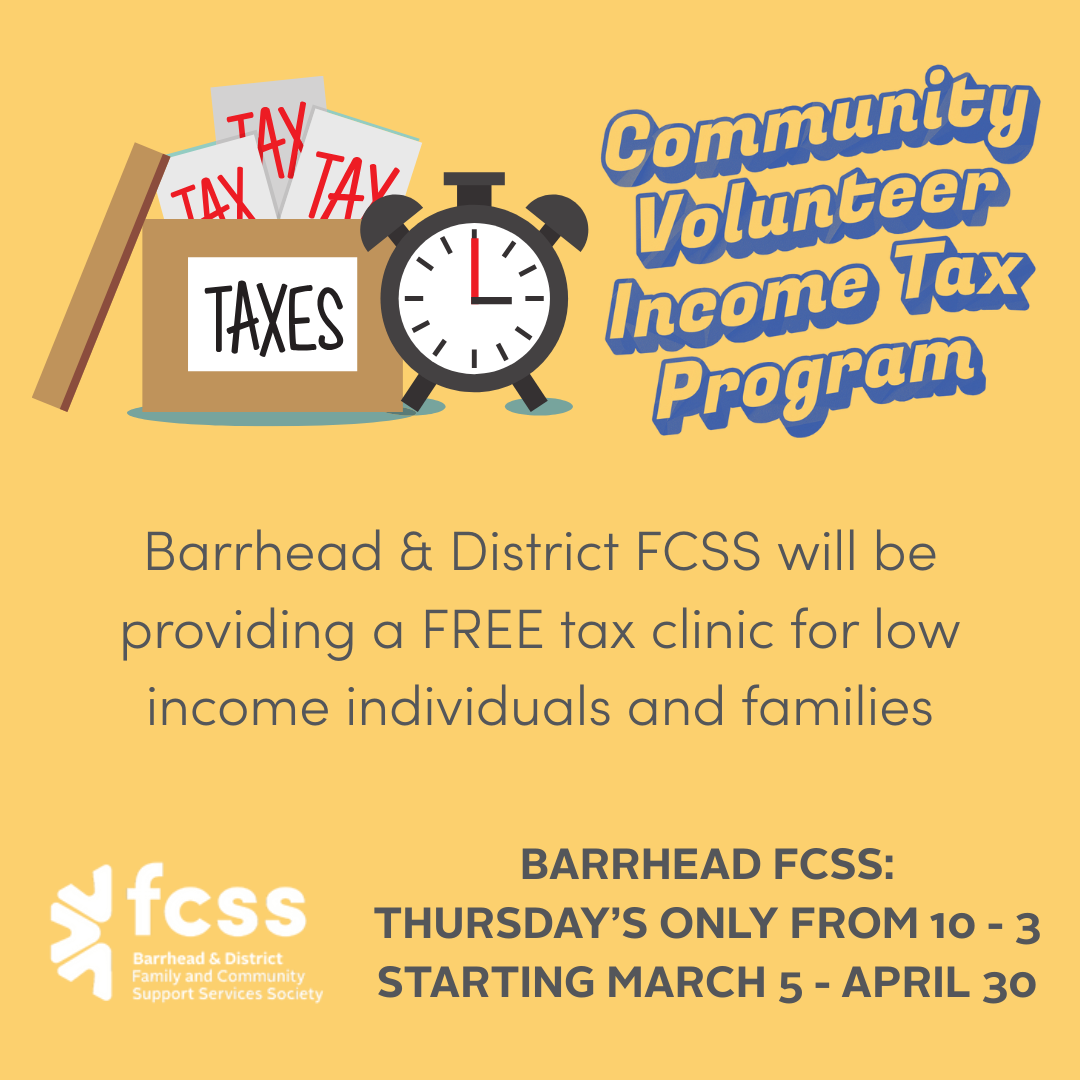 Community Volunteer Income Tax Program + Add to Google Calendar + iCal / Outlook export 00 days 00 hours 00 minutes 00 seconds Date Mar 19 2026 Time 10:00 am - 3:00 pm Location Barrhead FCSS 5103 - 51st Street Share this event