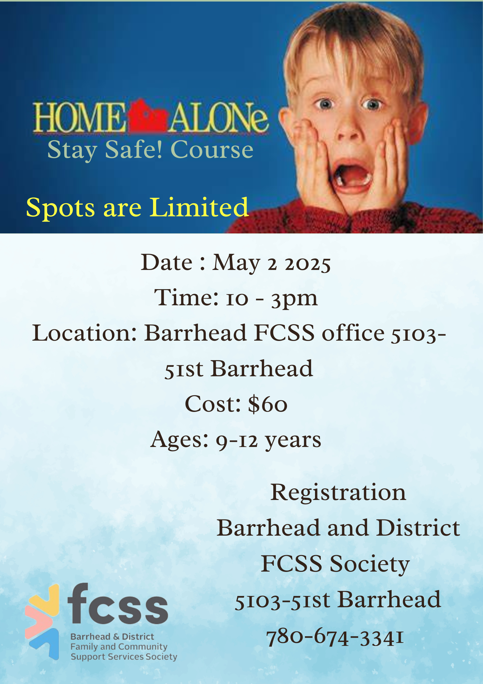 Home Alone – Stay Safe Course + Add to Google Calendar + iCal / Outlook export Date May 02 2025 Expired! Time 10:00 am - 3:00 pm Location Barrhead FCSS 5103 - 51st Street Share this event