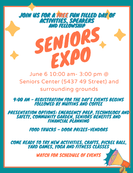 Seniors’ Expo Come out and join us for the 1st ever Seniors’ Expo!! A one day event where you can learn new things, meet new people, and have a fun-filled day!! Registration starts at 9 am followed by muffins and coffee and the rest of the days event. + Add to Google Calendar + iCal / Outlook export Date Jun 06 2024 Expired! Time 9:00 am - 3:00 pm Location Barrhead Seniors' Drop-In Centre Share this event